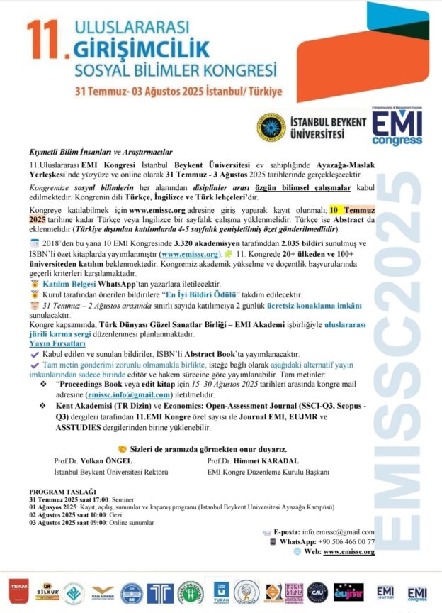 EMI CONRESSES will publish a special issue within the scope of the 11th International Entrepreneurship and Social Sciences Congress, organised by EMI CONRESSES, hosted by Istanbul Beykent University, where our Journal is also the publication sponsor.