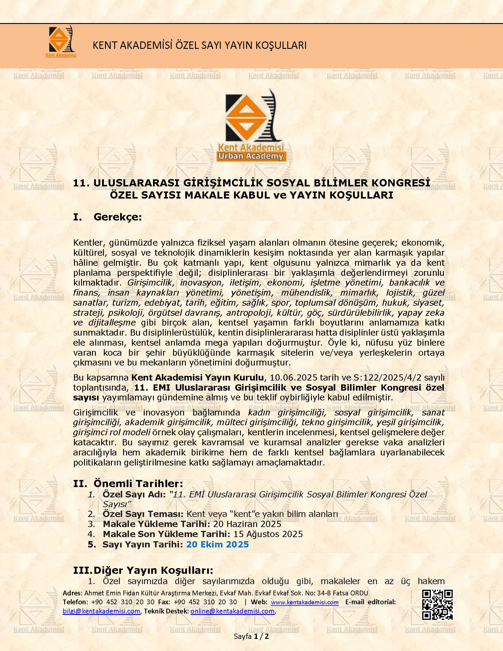 EMİ CONRESSES tarafından düzenlenen, İstanbul Beykent Üniversitesi ev sahipliğinde gerçekleşecek olan ve Dergimizin de yayın sponsoru olduğu 11. Uluslararası Girişimcilik ve Sosyal Bilimler Kongresi kapsamında özel sayı yayınlayacaktır.
